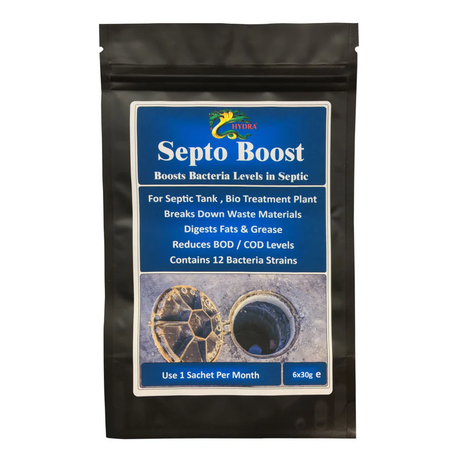 Hydra Septo Boost is a septic bacterial treatment that helps in maintaining odour free, smooth running drains. The product drastically reduces the instances of sewage backups and overflowing drains. Use in Klargester septic tanks, cesspools, septic tanks and cess pits. Septo boost acts upon and liquefies starch, oils, cellulose and grease. The powerful bacterial blend degenerate proteins as well as harmful chemicals that leach into the septic systems through indiscriminate use of household products meant for cleaning.